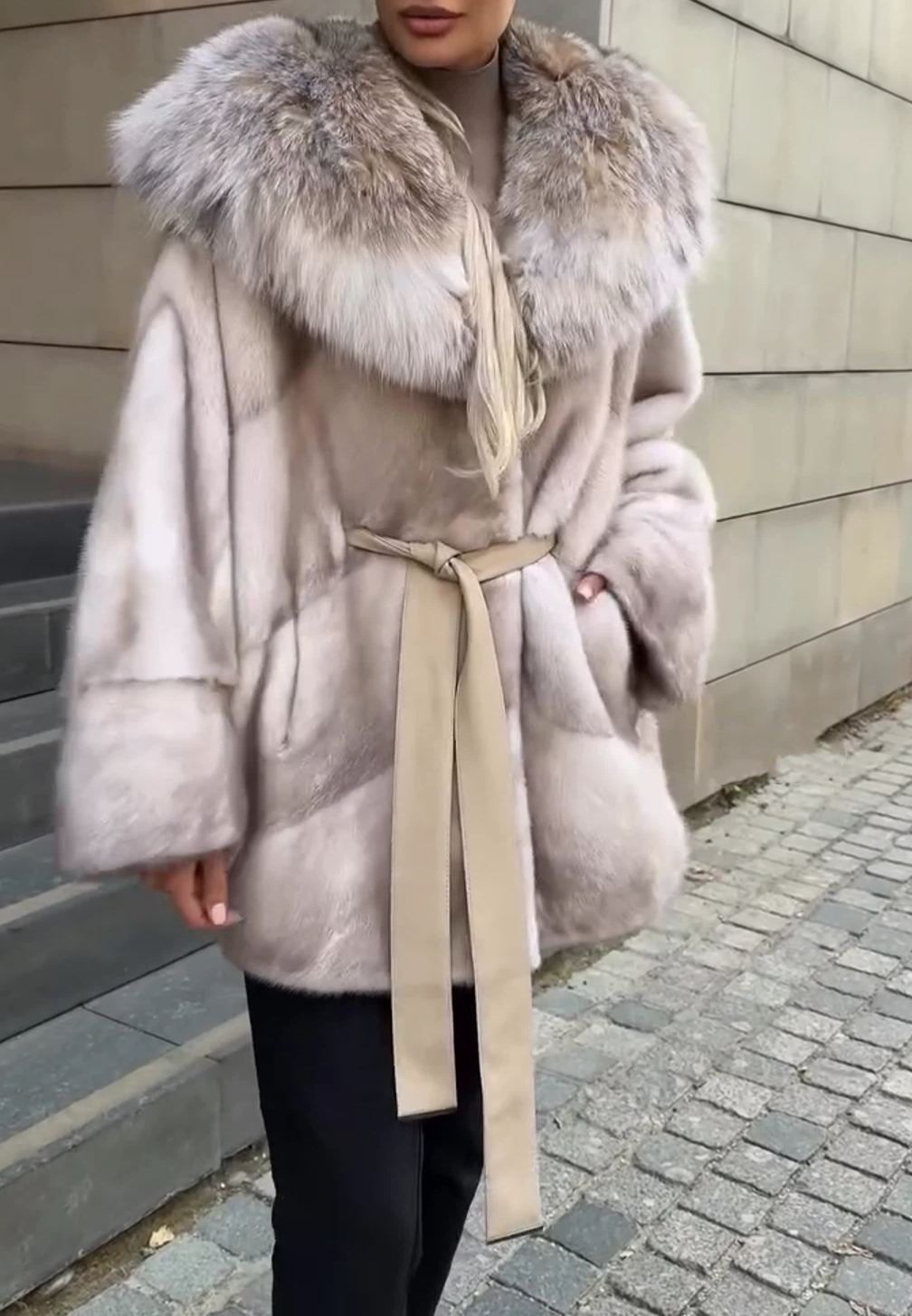 Cappotto in pelliccia sintetica beige chiaro con colletto in pelliccia di volpe oversize e cintura da annodare.