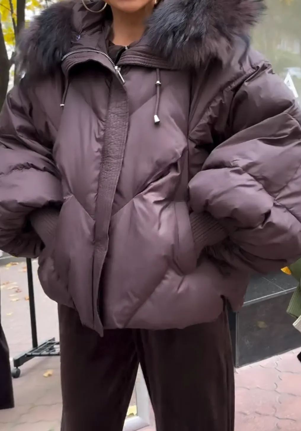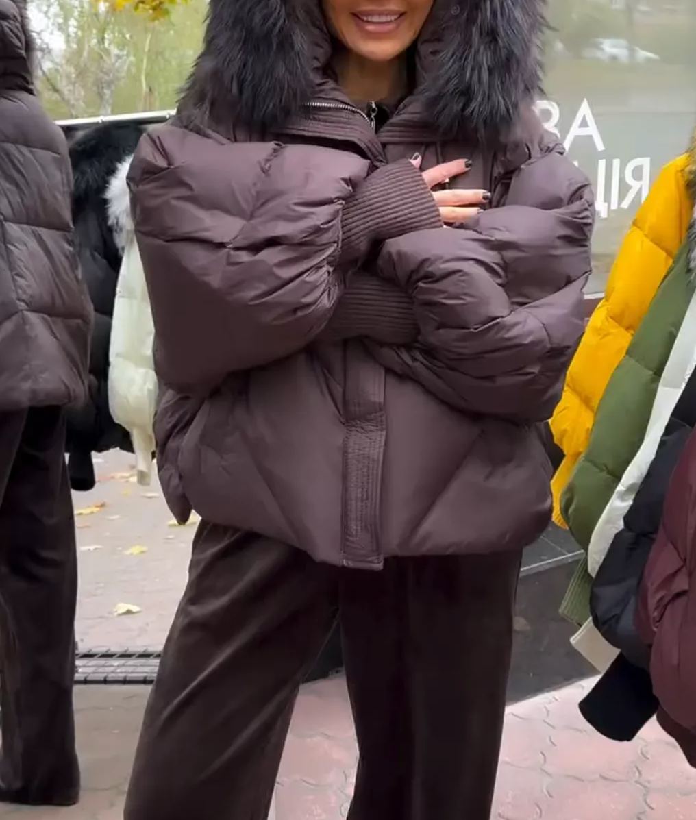 Piumino marrone scuro con cappuccio in pelliccia sintetica