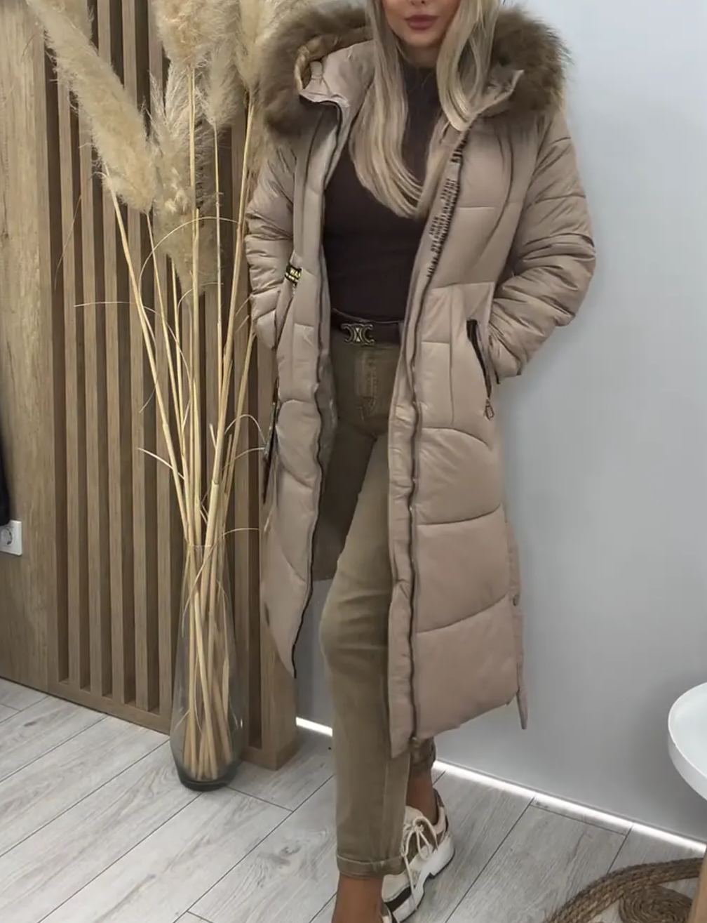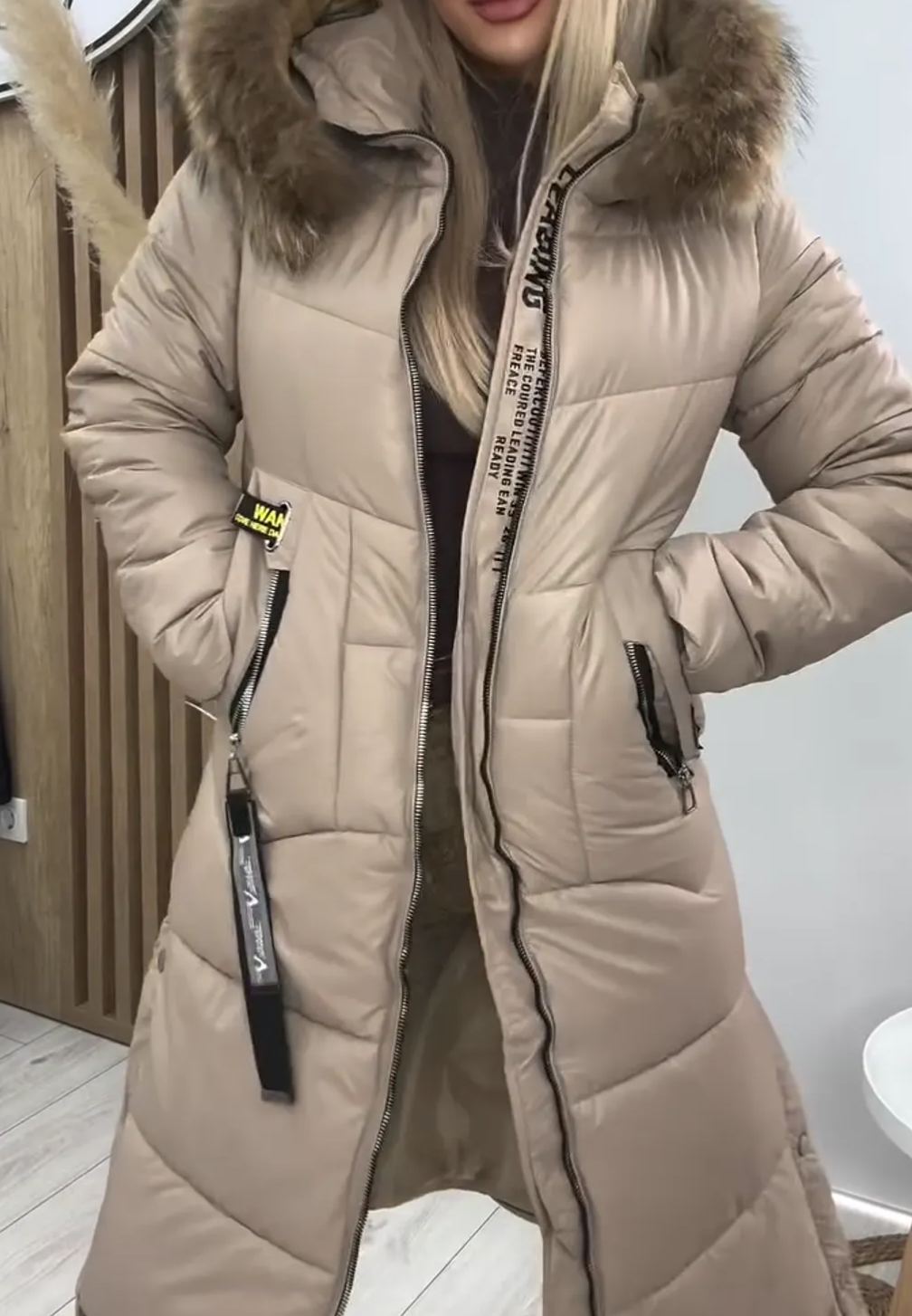 Piumino lungo beige con cappuccio in pelliccia sintetica