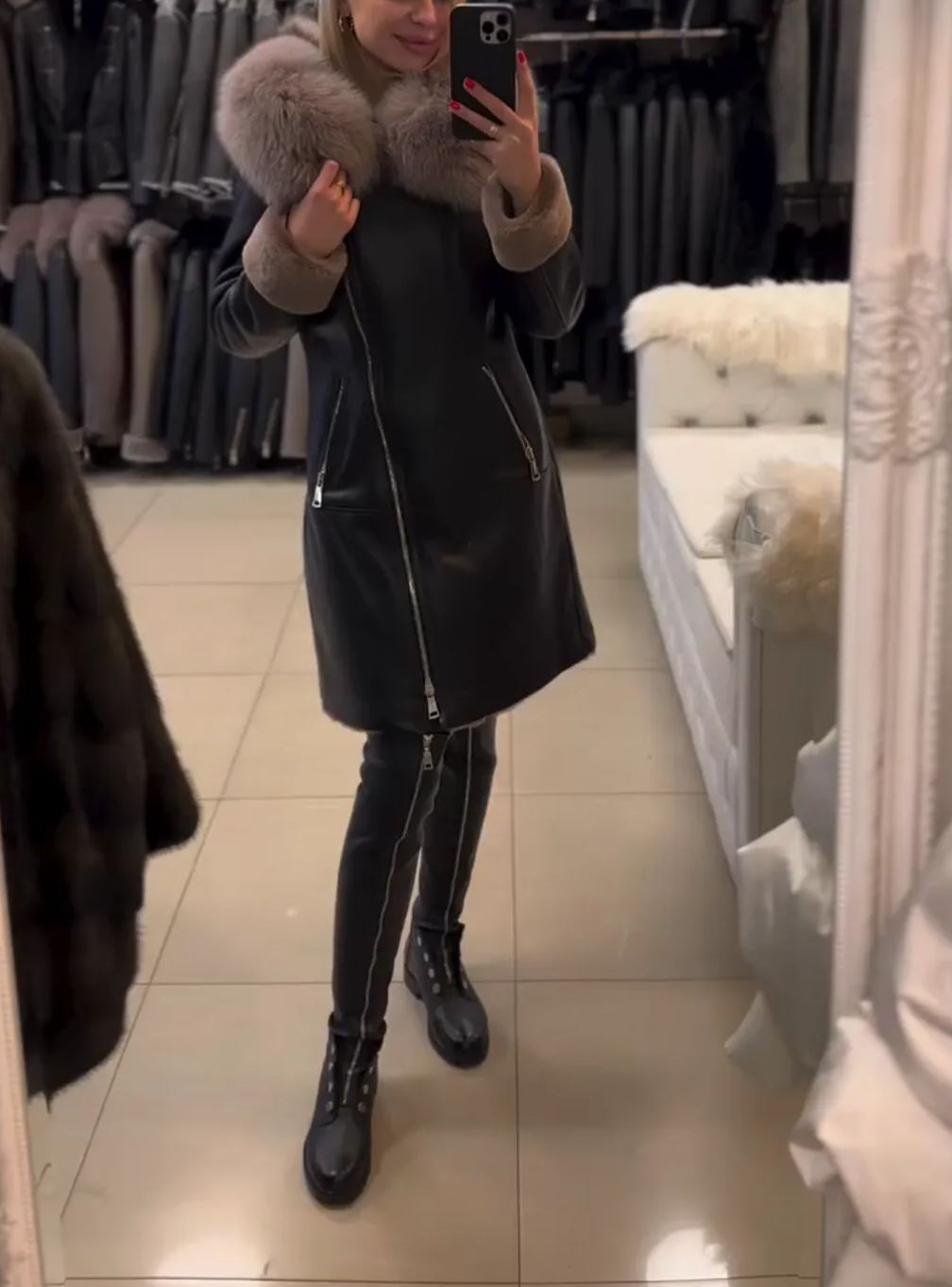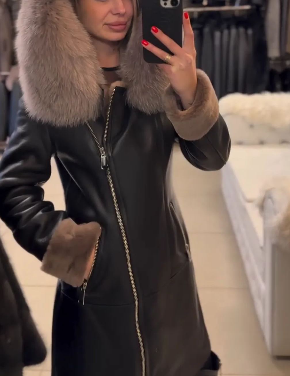 Cappotto in pelle sintetica nera con cappuccio in pelliccia sintetica beige oversize e rifiniture ai polsini