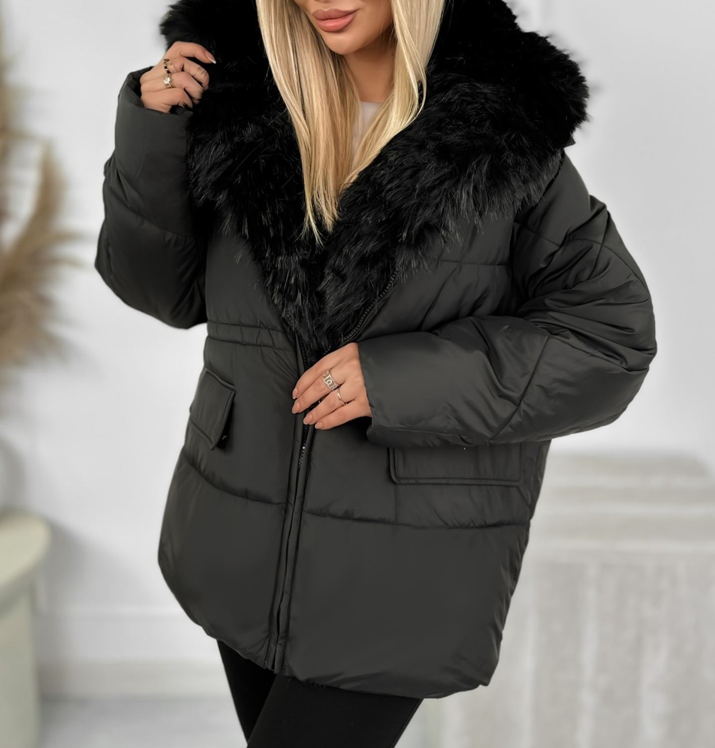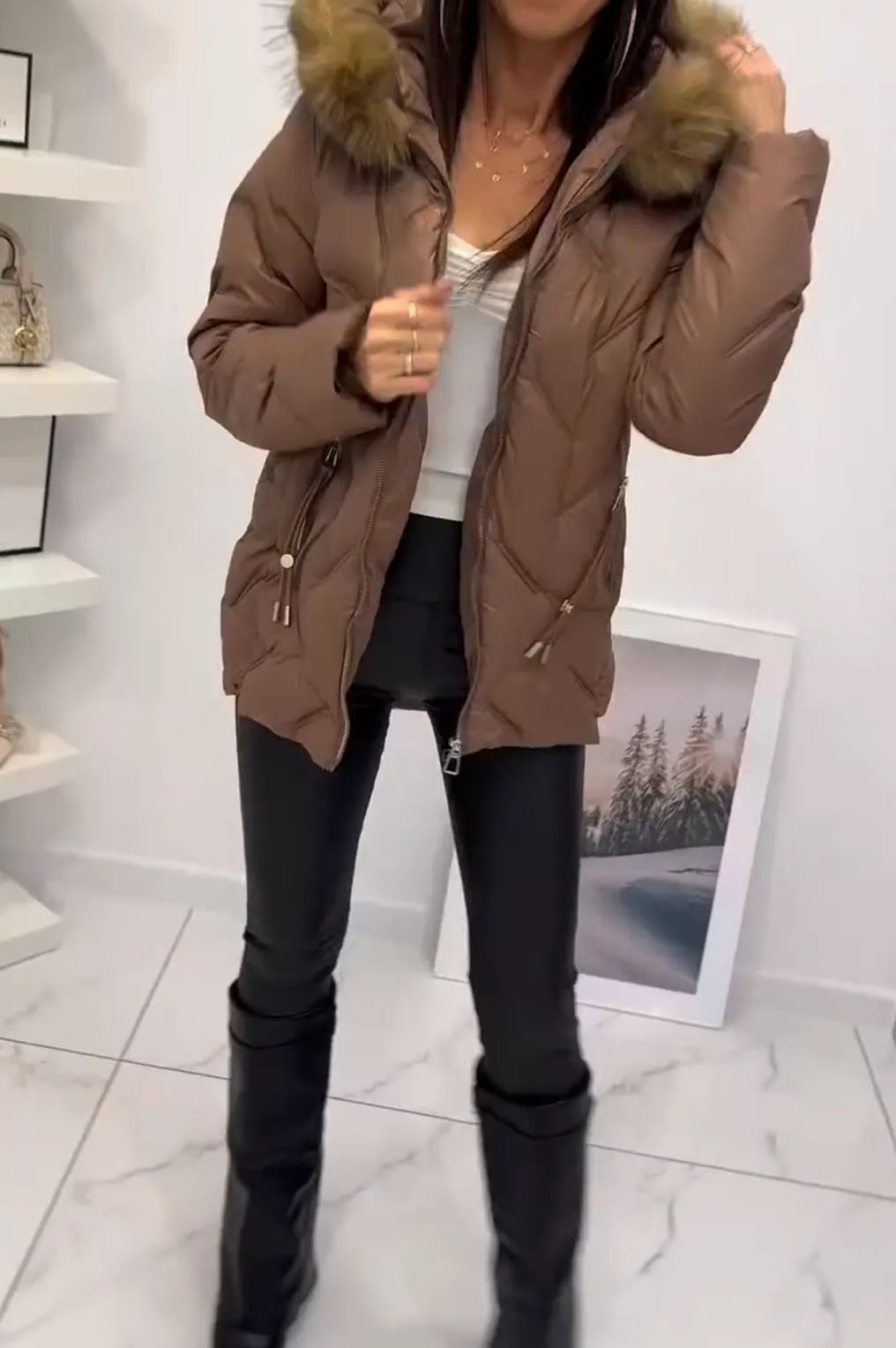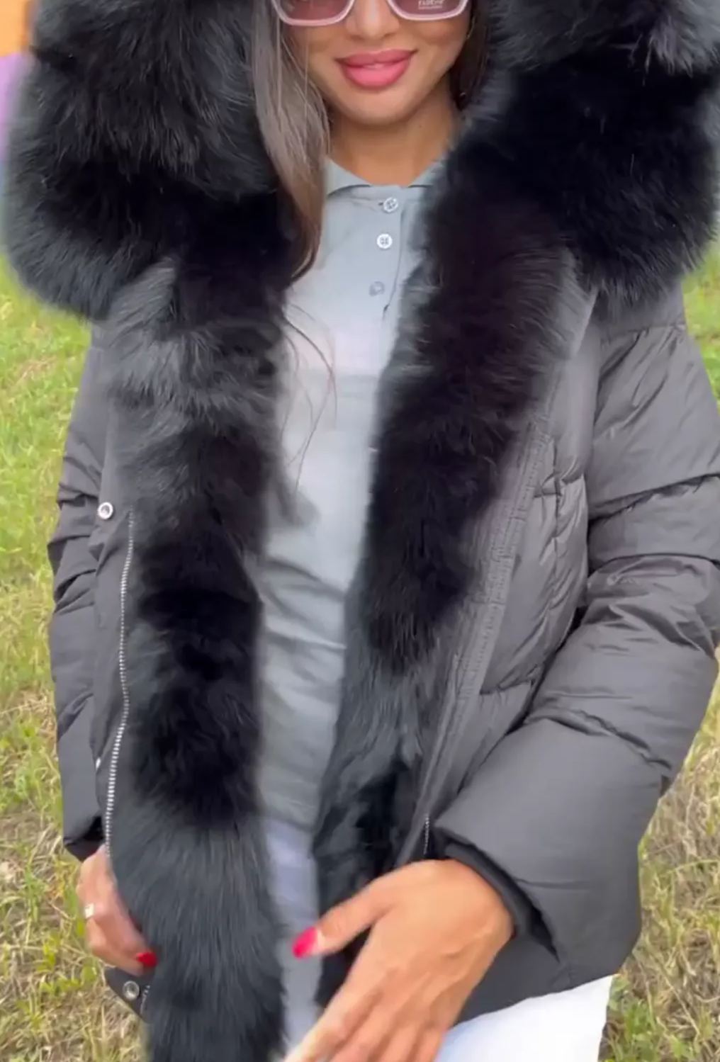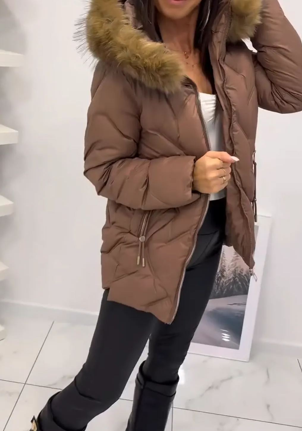 Piumino color talpa con cappuccio in pelliccia sintetica