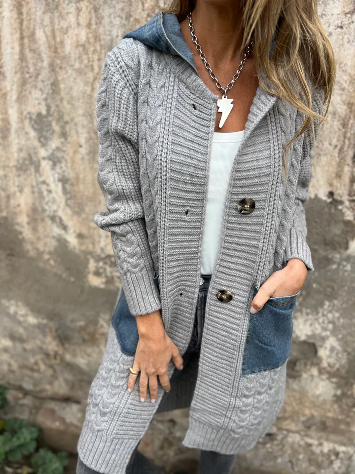 Giacca con cappuccio in maglia e patchwork di denim
