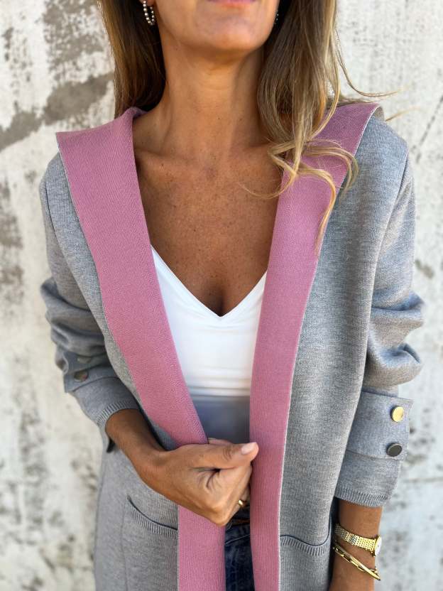 Cappotto bicolore grigio e rosa con bottoni
