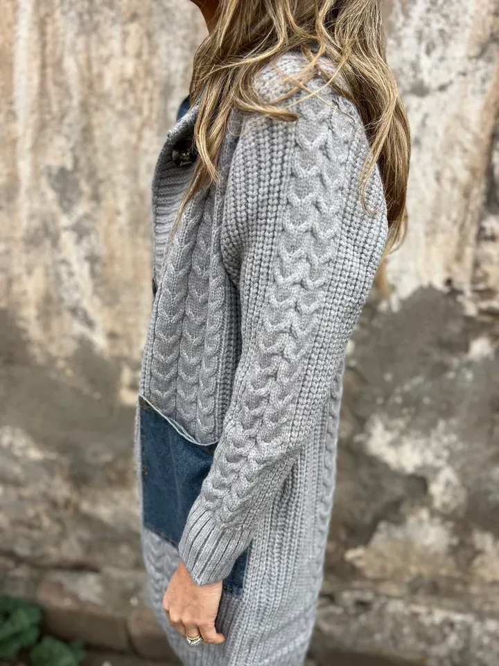 Un classico cardigan a maglia a trecce riceve un aggiornamento alla moda con dettagli in denim sulla cappuccio e sulle tasche. Ha grandi bottoni per una facile vestibilità e una silhouette rilassata perfetta per essere indossata sopra t-shirt o canotte.