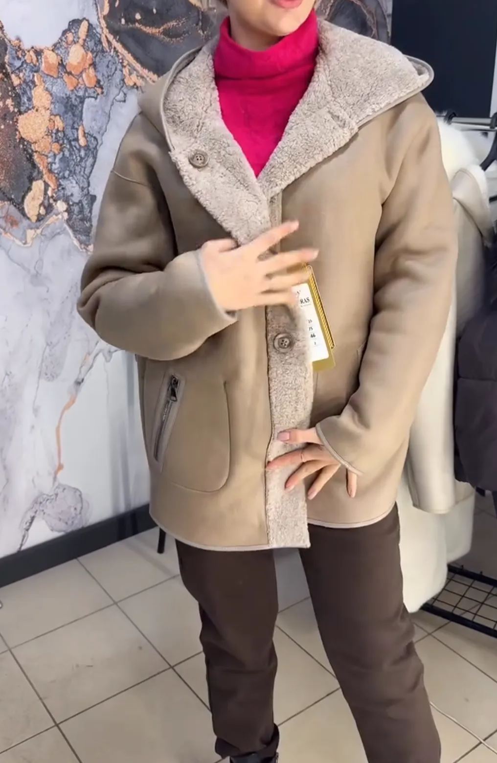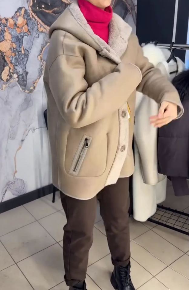 Cappotto reversibile in pelliccia di peluche beige e superficie liscia