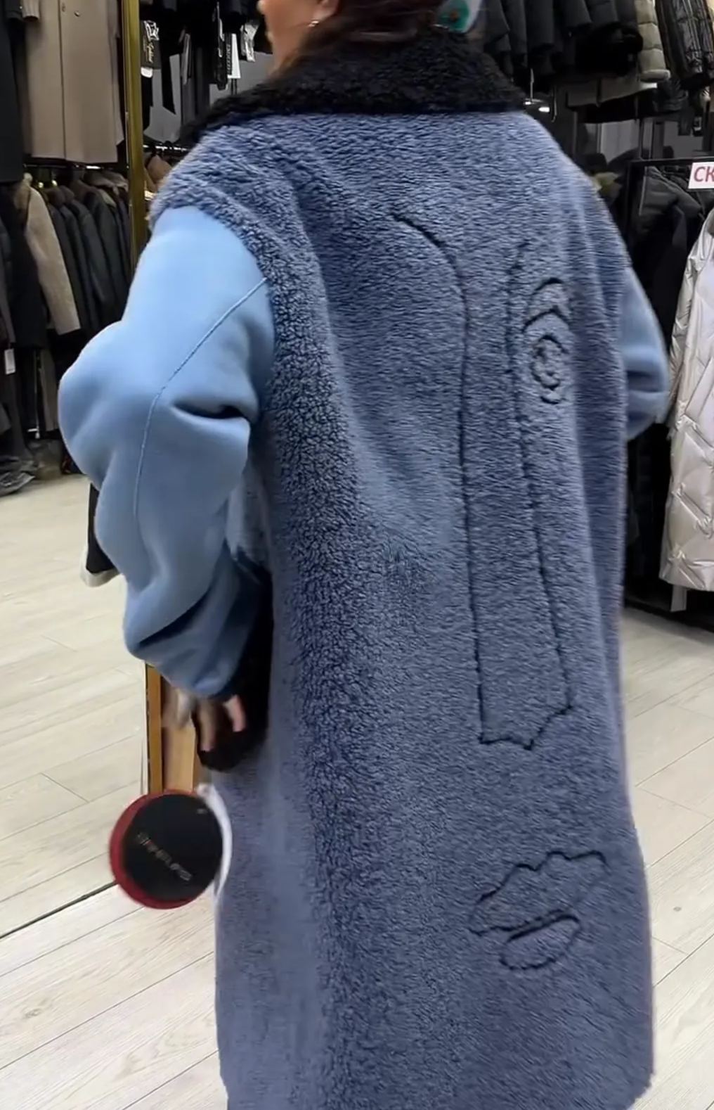 Cappotto reversibile in shearling blu con pannelli a contrasto